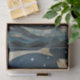 Frau mit langem Haar in einem Boot mit primitiven Malereien aus Fisch mit einer mondbeleuchteten Nacht mit einer schönen Frauenangeln am Abend, im Stil der primitivistischen Kunst, illusorisches Portrait, Seekandschaft.