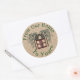Auf dem prächtigen, runden Aufkleber im Land befindet sich ein weinrosiges, primitives Salzkastenhaus mit Weidenbäumen auf jeder Seite. Der grüne Text lautet "Von unserem Haus zu deinem Haus" grün auf beigem Hintergrund. Ideal für jeden Anlass.