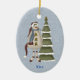 Dieser süße, primitive Schneemann hat eine lange Weihnachtsmannmütze auf, Sterne für Knöpfe und einen schönen warmen Schal. Er ist stehend neben einem schneebedeckten Baum vor einem Hintergrund blauer Wirbel. Die Rückseite des Ornaments hat den gleichen blauen Wirbel Hintergrund und kann personalisiert werden, da es vollständig anpassbar ist.