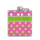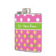 Eine Hip Flask zum Personalisieren, mit hübschen Mix'n'match-Mustern: Jumbo-Polodots auf tiefrosa und Mini-Print-Muster aus gelben Primaten und grünen Polka-Punkten, auch auf tiefrosa. Teil der Posh & Painterly "Primroses" Kollektion.