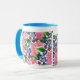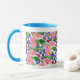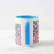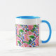 Eine Tasse aus weißem Ringer in guter Qualität mit puderblauer Felge und Griff. Das handgemalte Blumendesign besteht aus rosa und blauen Primaten, und der Text um die Spitze lautet: "Eine besondere Tasse für eine besondere Mutter. Spülmaschinen und Mikrowellen geeignet. Siehe auch passende Grußkarten, Geschenke und Kleidung.