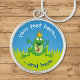 Prinzfrosch Cartoon mit Krone über grünem Gras unter blauem Himmel. Zwei benutzerdefinierte Textfelder im Kreis.