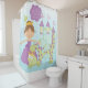 Ein niedlicher, lustiger, gürteliger Duschvorhang, den Ihre kleine Prinzessin Liebe bekommt, mit einer braunhaarigen Prinzessin, Burg, Froschprinz und einem mit Polka gepunkteten Drachen!