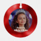 This metal Christmas ornament is shown with a holiday sample photo print and text: Princess, name and date.