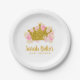 Princess Fairytale Baby Shower Paper Plate zeigt eine Glitzer Goldkrone auf Aquarellrosa Rosen und Peonies. Entsprechende Artikel finden Sie auf unserer Website: www.wordsandconfetti.com