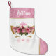 Hübscher, rosa-weißer Weihnachtsweih-Strumpf mit goldenen Tonakzenten und dem Gesicht eines Kätzchens, in der Mitte. Das Gesicht des Kätzchens hat goldene Töne und Ohren, trägt rosa Blume und eine rosa Krone auf dem Kopf. Personalisieren Sie den weißen Namen oben für Ihr Haustier oder Kind.