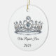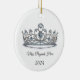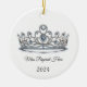 Dieses Keramik-Ornament wird in runder Form mit einem glitzernden Kristalltiara mit schwarzem Text auf weißem Hintergrund gezeigt. Passen Sie dieses Element an und ändern Sie den Beispieltext mit Ihrem persönlichen Seitennamen, Datum oder anderem. Lizenziertes Bild
