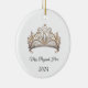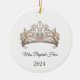 Dieses Keramik-Ornament wird in runder Form mit einem glitzernden Kristalltiara mit schwarzem Text auf weißem Hintergrund gezeigt. Passen Sie dieses Element an und ändern Sie den Beispieltext mit Ihrem persönlichen Seitennamen, Datum oder anderem. Lizenziertes Bild