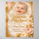 An extraordinary newborn invitation design that blends childhood innocence with palace-like grandeur. The design features a soft, artistic silk background embracing a joyful baby's smile, framed by an intricate 3D gold filigree border. The corners are adorned with hyper-