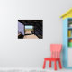 Es handelt sich um einen farbenfrohen Raum mit violett und violett. Die helle Wüstensonne verlasse diagonale Schatten an den Wänden, die interessante Muster erzeugen. Die rauen Holzfäller, die die Türe umrahmen, schaffen ein Portal, das den Betrachter einlädt, in die Wüstenlandschaft, die in der Ferne liegt, zu treten.