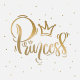 Illustration des Wortes "Prinzessin" in einem stilisierten, kursiven Schriftart, gerendert in metallischer Goldfarbe. Das Wort ist mit kleinen Kronen-Icons über dem "i" und zwischen "P" und "r" geschmückt. Eine größere Krone wird über dem Wort positioniert, um das Regal-Thema zu ergänzen. Der Hintergrund ist weiß, mit kleinen Goldpunkten verstreut, die einen subtilen, festlichen Effekt erzeugen. Der gesamte Stil ist elegant und dekorativ, geeignet für Feiern oder Themendesigns.