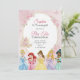 Eine Einladung im Pastell-Look für eine Teeparty zum 6. Geburtstag mit Illustrationen von Prinzessinnen in eleganten Kleidern. Der sanfte rosa Hintergrund und die floralen Akzente verleihen einen zauberhaften, festlichen Ton. Die Details der Veranstaltung sind elegant in Kursivschrift über den Prinzessinnen gedruckt. Die Rückseite der Einladung ist hellrosa. Schlüsselwörter: Geburtstag, Party, Prinzessin, Einladung, Teeparty, Feier