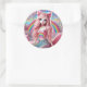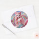 Ein traumhaftes Katzenmädchen trifft eine spielerische Pose, umgeben von sanften Farbtönen, Schimmer und charakteristischen rosa Bögen.