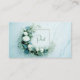 Define your brand with pristine clarity and serene elegance using this captivating business card. The design features a stunning white marble background with subtle cool blue-green veining, creating a luxurious, high-end surface. A delicate metallic gold rectangular frame sits centered on the card, providing a sophisticated focal point. This frame is beautifully highlighted by a crescent-shaped floral wreath composed of lush white roses, vibrant electric blue filler flowers, and delicate white baby's breath. The overall aesthetic is fresh, cool, and refined, blending the artistry of nature with the polish of high-end stone. This business card is ideally suited for a high-end spa or wellness brand emphasizing purity and cool tones, a boutique jewelry designer showcasing white gold or diamond pieces, or a modern minimalist florist specializing in crisp, cool-toned arrangements. It would also perfectly suit a luxury interior designer who favors marble and cool color palettes, or a fine art print seller focused on serene nature compositions.