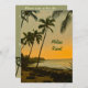 Einladungen für ein Abendessen in der Probe, die romantisch und am Strand gelegen sind, mit einem Sonnenuntergang-Foto an einer Palmenküste.