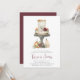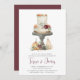 Dieses zauberhafte Abendessen im Herbst oder Herbst bietet eine Aquarellillustrierung eines kunstvoll gestuften Kuchens, der mit Kürbissen, Grünpflanzen und bordeauxfarbenen Blume geschmückt ist und in sanften Grau- und Bordeaux-Schriftzeichen unterlegt ist.