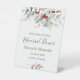 Elegantes Winter Greenery Probe Dinner Pedestal Zeichen. Dieses Design zeigt eine Darstellung von grünem Blattwerk und roten Beeren im Aquarellstil auf weißem Hintergrund.