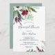 Diese Probe lädt zum gemütlichen Abendessen im tropischen Ambiente ein, um eine Probe im Frühjahr oder Sommer zu genießen. Das Blumendesign mit roten, bordeauxroten, rot-weißen Blume auf einem Eukalyptusbett im Wasser und tropischer Vegetation mit entspanntem hawaiianischem Ambiente.