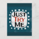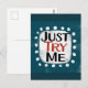 Ein lustiges typografisches Design, das "Just Try Me" sagt. Es ist schwarz und rot auf einem weißen Rechteck mit funky, spielerisch weißen Punkten, die ihn umgeben, alles auf einem aquamarinen Hintergrund.