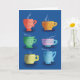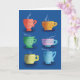 Sechs Dampf-Tassen fröhliches Set auf blauem Hintergrund, wird den Empfänger begeistern. Jedes ist einzigartig und macht Spaß mit verschiedenen Mustern und Farben für eine helle Karte. Diese Karte kann von einer Gruppe von Leuten geschickt werden, um jemandem zu wünschen, sich besser zu fühlen und lassen, dass er weiß, dass er an sie denkt.