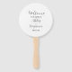 Hochzeitstag Zeremonie-Programm auf einem runden Stil Hand-Fan, der einen weißen Hintergrund mit den Braut-und Bräutigam-Namen und Datum auf der Vorderseite des Fans, sowie dunkelgraue, stilisierte Skripte, die die Teilnehmer der Hochzeitsfeier und Zeremonie Rites auf der Rückseite des Fans. Bearbeiten Sie den Handventilator und ersetzen Sie Namen und Informationen durch Ihre eigenen Hochzeitsprogramminformationen. Ideal für einen Sommer- und Hochzeitsort im Freien! Wählen Sie die Anzahl der gewünschten Handlüfter aus.