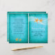 Hochzeitszeremonie am Strand mit Sternenpaarung und türkisfarbenem Schleier und gefaltetes Party mit einigen orangefarbenen Seestern auf weißem Schleier auf türkisblauem und aquamarinem grunem Hintergrund. Dieses moderne Aqua-Hochzeitsdesign ist Teil einer Hochzeitskollektion und ist ein vollständig anpassbares Template, das sich perfekt für eine Sommerhochzeit am Strand eignet. Man muss es in der Mitte falten. Wählen Sie nur diesen Papierwert aus, da er sich gut faltet.