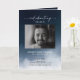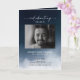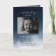 Beerdigungs-Gedenkprogramm mit einem Foto der Verstorbenen, ihrem Namen, ihren Daten, der Gedenkstätte, dem Veranstaltungsdatum und dem eleganten marineblauen Nebel-Hintergrund. Im Inneren ist eine Gedenktafel, und die Dienstordnung; und auf der Rückseite ein anderes Foto, ein Dankeschön und der zweite Ort für nach der Beerdigung. Für weitere Anpassungen klicken Sie bitte auf den Link "Edit using Design Tool" und verwenden Sie unser Designwerkzeug, um diese Vorlage zu ändern. Wenn Sie Hilfe oder passende Artikel benötigen, kontaktieren Sie mich bitte.