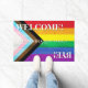 Dieses freundliche Doormat verfügt über eine schöne Progress Pride LGBT Regenbogenflagge mit einem Hintergrund für Strandfotografie. Die Regenbogenflagge ist ein Symbol für den LGBT-Stolz und diese Türmatte ist eine großartige Möglichkeit, Ihre Unterstützung für die Gemeinschaft zu zeigen.
