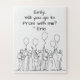 A sweet and romantic way to ask a girl or boy to prom! Will you go to prom with me personalized puzzle. Just add names and proposal in the personalize area. Black and white line art of teens holding balloons.