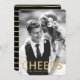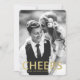 Feiern Sie das neue Jahr mit Ihren Freunden und Ihrer Familie, indem Sie ihnen eine moderne Silvesterkarte schicken. Die stilvolle Fotokarte enthält das Wort "Cheer" in einem Imitat Goldfolie-Schriftart und Platzhalter für Text und Foto. Auf der Rückseite der Karte befindet sich ein schwarzer Hintergrund mit Imitaten, goldgelben Streifen, die von Hand gezogen werden. Die schwarze Farbe kann mit dem Tool Anpassen in eine Farbe Ihrer Wahl geändert werden.