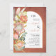 Tropische Protea Blume Pampas Gras und Eukalyprus Blätter Terracotta Bogen Hochzeit Einladung. Dieses schöne Hochzeitsdesign besticht durch einen Bogenrahmen auf Terrakotta-farbenem Hintergrund mit Ihren Initalien und Text. Auf den verlassen gibt es Protea-Blume, Pampas-Gras und Eukalyptus-Blätter.