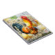 Ein Barkeeper-Hahn, der von einem Bienenstock seiner Dame gerahmt ist, hennt und heut sich um ihn herum. Die sanften Gelbtöne und Grautöne bringen den farbenfrohen Hahn ins Zentrum der Aufmerksamkeit, genau dort, wo der stolze Vogel gerne ist. Dies ist ein Mischmedium, das in Ölpastellfarben und farbigem Bleistift zeichne. von Amanda Diehl, Paxdomino Designs