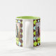 Diese Tasse wird zwei Fotos des kleinen Typ, seinen Namen und Details enthalten, die alle in den Drucken der Raute in grün, aqua und braun gemacht sind.