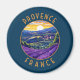 Provence Retro Vektor Reise Design. Die Provence ist eine historische und kulturelle Region im Südosten Frankreichs. Bekannt für seine vielfältigen Landschaften, von den südlichen Alpen und der Camargue-Ebene bis hin zu Weinbergen, Olivenhainen, Kiefernwäldern und Lavendelfeldern.