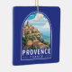 Provence Retro Vektor Reise Design. Die Provence ist eine historische und kulturelle Region im Südosten Frankreichs. Bekannt für seine vielfältigen Landschaften, von den südlichen Alpen und der Camargue-Ebene bis hin zu Weinbergen, Olivenhainen, Kiefernwäldern und Lavendelfeldern.