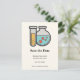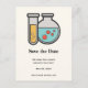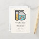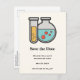 Save the Date Postkarte mit einer niedlichen Abbildung eines Reagenzglases mit gelber Flüssigkeit und einem abgerundeten Kolben/Becherglas mit grüner Flüssigkeit mit roten Blasen.