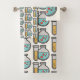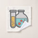 Gemustertes Handtuch-Set mit einer niedlichen Abbildung eines Reagenzglases mit gelber Flüssigkeit und einem abgerundeten Kolben/Becherglas mit grüner Flüssigkeit mit roten Blasen.