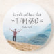 Inspirational quote scripture coaster depicts a art photograph of a man standing on a hill overlooking a mountain range with his hands lifted in prayer. It feys an promoaging Bible Verse Psalm 46:10, "Be still and know that I am God."