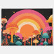 A vibrant psychedelic landscape filled with colorful mushrooms glowing beneath a radiant sunset. This imaginative design blends retro color palettes with dreamy fantasy elements, creating a magical nature scene full of warmth, energy, and wonder. The bold rainbow sunset and whimsical mushroom forest evoke vintage psychedelic art and surreal nature aesthetics.