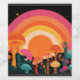 A vibrant psychedelic landscape filled with colorful mushrooms glowing beneath a radiant sunset. This imaginative design blends retro color palettes with dreamy fantasy elements, creating a magical nature scene full of warmth, energy, and wonder. The bold rainbow sunset and whimsical mushroom forest evoke vintage psychedelic art and surreal nature aesthetics.