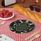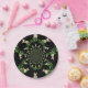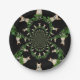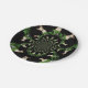 Psychedelischer beige und weißer Chihuahua mit grünen Reben auf schwarzem Hintergrundpapier-Teller. Kaleidoskopmuster. Lustiger, humorvoller, verzerrter Hund in einem Kreismuster. Dieses ist für die Hunde- und Chihuahualiebhaber. Komische aussehend Chihuahua. Vervollkommnen Sie für Geburtstagsfeiern oder jede mögliche Gelegenheit. Chihuahuahundephotographie. Fotografie des Chihuahuahundes.