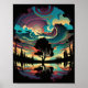 Seenlandschaft mit Silhouetten und psychedelischem Wolkenhimmel.