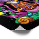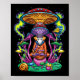 Das Bild zeigt eine psychedelische Szene mit einer zentralen Figur eines weise aussehenden Mannes, der in einer Lotusposition meditiert. Er ist umgeben von einer lebhaften Auswahl an bunten Pilzen, darunter ein großer, schirmförmiger Pilz, der über ihm thront. Flammen verschiedener Farben tanzen um die Pilze herum und schaffen so eine mystische und weltliche Atmosphäre.