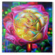 Ein faszinierendes digitales Bild einer Rose, die mit psychedelischer Energie und Regenbogenfarben platzt. Die lebhaften rosa Blütenblätter umwickeln einen goldenen Kern und bilden ein surreales Blumenzentrum.