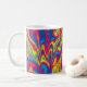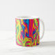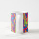 Eine Tasse mit einem farbenfrohen und abstrakten psychedelischen Design mit gewellten Mustern.