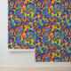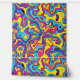 Dieses Kunstwerk präsentiert eine lebendige und energetische Komposition wirbelnder, gewellter Linien in einem Kaleidoskop von Farben. Das Design zeichnet sich durch fett überlagernde Formen in den elektrischen Farbtönen Gelb, Blau, Rosa, lila und Orange aus, wodurch eine dynamische und flüssige Bewegung im gesamten Stück entsteht. Die schimmernden Formen und die intensive Farbpalette erinnern an die Psychedelie der 1960er und 1970er Jahre: Das Zusammenspiel von Kurven und Kontrasten macht das Kunstwerk visuell anregend und lebendig.
