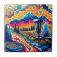 Einzigartige ai-Kunst, die einen bunten Vintagen, Retro-farbenen Golfplatz, Kiefern und Bergen darstellt.