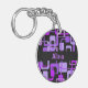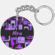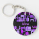Dieser kundengerechte Schlüsselanhänger hat ein funky Muster der Retro-aussehenden lila Quadrate. Die Hintergrundfarbe ist schwarz, aber Sie können das ändern, wenn Sie wollen.
