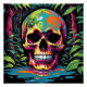 A.I.created print of a vibrant multiticfarben skull is umgeben von üppig grünen Blätter, wodurch ein auffallender Kontrast zwischen natürlichen Elementen und psychedelischen, surrealen Bildern entsteht.