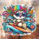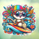 Das Bild zeigt einen Cartoon-Otter, der cool aussieht, wenn er auf einem bunten Surfbrett surft. Der Otter trägt einen mit Regenbogen gestreiften Eimerhut und eine übergroße rosa Sonnenbrille. Es hat auch eine braune Ukulele. Die Otter und Surfbretter sind Set vor einem Hintergrund wirbelnder blauer Wellen und einem psychedelischen Design aus Blume, Blätter und abstrakten Formen in lebhaften Farben wie Rosa, Blau, Grün, Orange und Gelb. Das Ganze ist spielerisch, skurril und voller Energie.